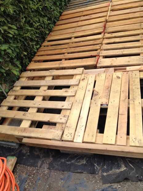 Paño de malezas fue establecido, se colocaron adoquines de 1'x 1' en cada esquina de la cubierta y en el cruce de donde aterrizaría las esquinas de la plataforma, luego organizamos las paletas en la parte superior. Tornillos sobrantes se utilizan para sujetar los palets entre sí y madera fue utilizado para llenar los huecos entre plataformas. Nos apuntalada en los lugares donde cosas no estaban sentados bastante nivel en los adoquines con rocas y ladrillos de desecho.