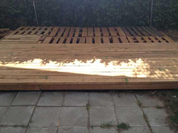 Entonces era tiempo de poner 2x4s sobre la plataforma. Comenzamos en el borde delantero y colocados los primeros consejos se cernía sobre el borde delantero por aproximadamente 1/4" y en cada extremo por aproximadamente 1" - 2". Una vez más, tornillos drywall se utilizan para sujetar el 2x4s a la plataforma. Como tableros más fueron agregadas, las costuras donde 2x4s empalmados juntos fueron colocadas así que aterrizaron sobre la madera de palet y fueron staggared, con piezas sobrantes de filas anteriores para asegurarse de que las costuras buscados al azar. Los extremos de los tableros terminaban colgando sobre el borde de la cubierta de varias cantidades.