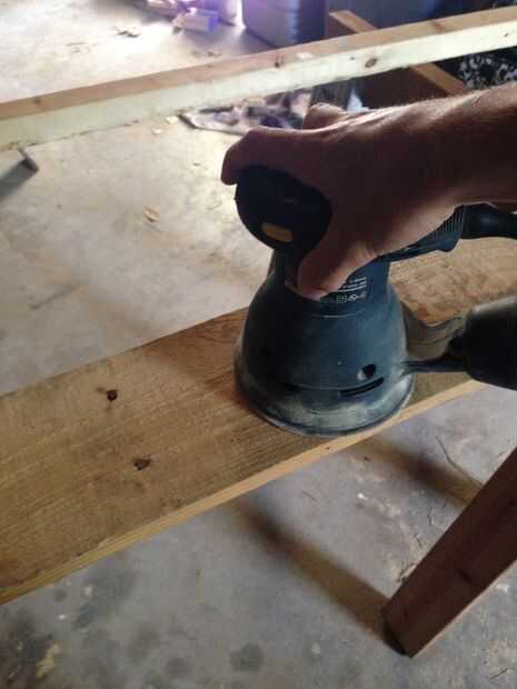 lo más probable es la madera que sólo se reunieron es bastante chungo de madera, buena madera no se utiliza para hacer paletas, al menos a través de mi experiencia. La madera que recogí tenía muchas astillas poco, pegado por todas partes, se curva ligeramente y tenía un extraño tinte gris a él. Para hacer la madera bastante y ser funcional recomiendo usar una lijadora de Palma / lijadora orbital para eliminar las astillas, junto con una lijadora de banda para alisar hacia fuera algunas de las deformidades más grandes en la madera y si es posible quitar las ligeras curvas en la madera. Asegúrese de hacer un largo borde de ambas piezas de madera suave y estrecho como va a ser pegarles en el paso siguiente. también sería una buena idea para cortar la madera a la longitud que quieras que sea.