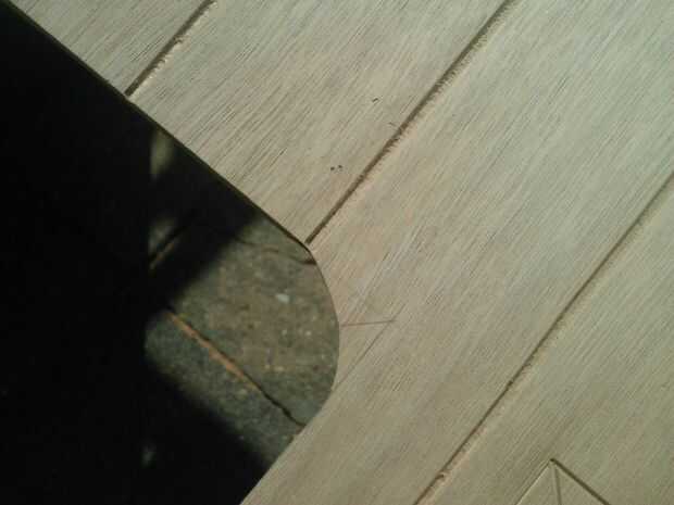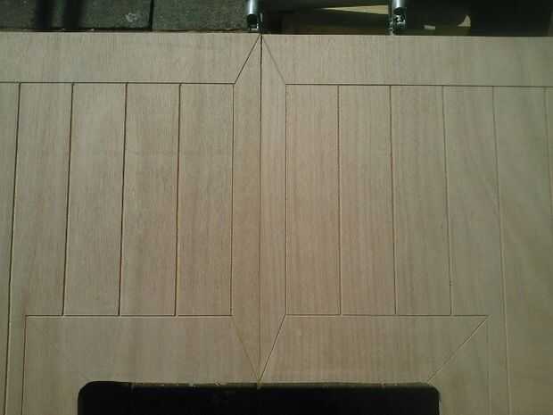 Con las escotillas maltratadas, mida y trace líneas para las tablas llenar la cubierta, usando una línea central y trabajar hacia afuera a ambos lados es la manera más eficaz, si desea, también puede agregar alguna decoración hay, y si usted necesita más de 2 tableros de lado a lado, la línea central es el mejor lugar para unirse a ellos (ver foto para mi solución adjunta).