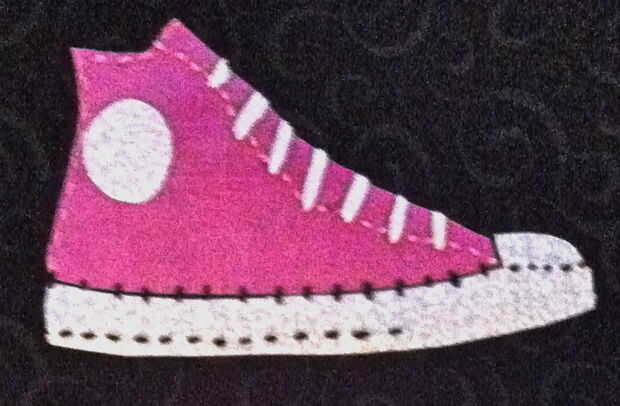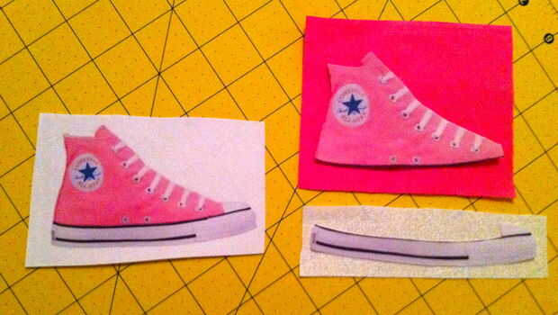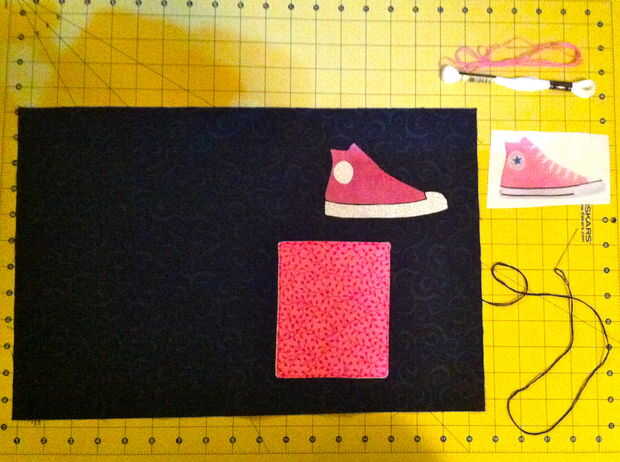 La siguiente parte es donde este applique difiere un poco del pasado. En vez de mano costura puntadas pequeñas todo el camino alrededor de los bordes del diseño, esta vez que va a ser más creativos y utilizar mano embroidary para agregar los datos de un zapato Converse. Utilizar colores diferentes de hilos embroidary para crear los cordones, las líneas de suela de goma negra y cualquier otras pequeñas puntadas se muestra en la imagen de Converse original. (* Ver cuadro #3 por ejemplo) El detalle más añade, más segura será la apliques durante desgaste, y más asombrado la persona especial que recibe el regalo será por tu trabajo inpressive!