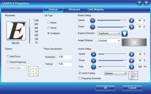 Una vez listo, envíe a la impresora láser. Estoy usando un Epilog 60w y estos son los ajustes que utilicé para los cortes de la trama y vector.