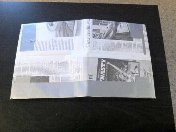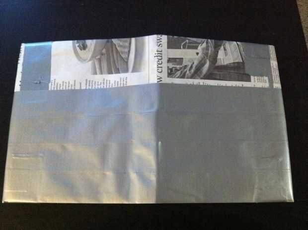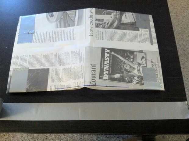 Tomar las tiras de cinta que son de 2 a 4 pulgadas más largos que la cubierta del libro y empezar a cubrir el periódico. Hacer esto hasta que el diario entero está cubierto de cinta adhesiva.