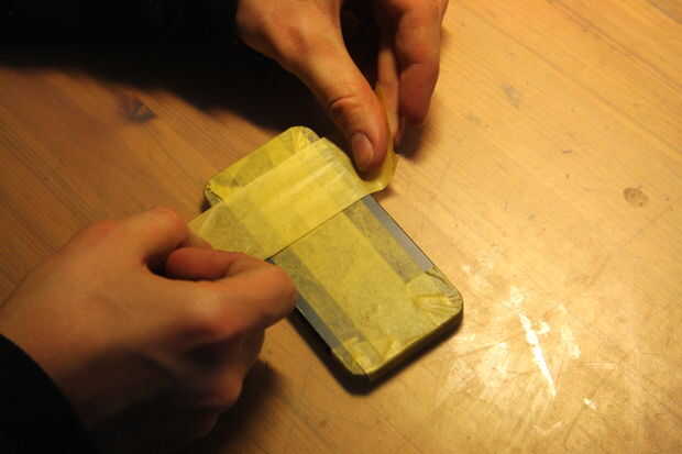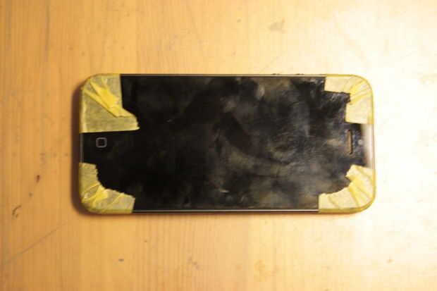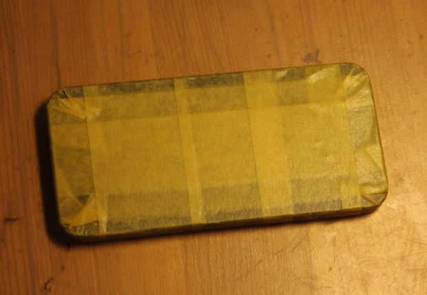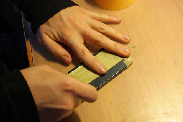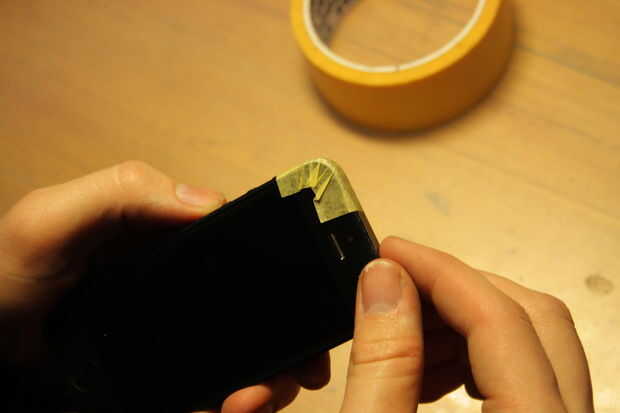 Usted tiene que proteger su teléfono, use cinta que no dejará manchas de pegamento. Experiencia me enseñó que es mejor empezar con las esquinas, porque en el paso final cuando usted pela del pegamento, algunos de la cinta se tienden a pegarse, especialmente en las esquinas. Asegúrese de que la cinta va más de las esquinas, también protege la pantalla, porque vendrá el pegamento sobre el borde.