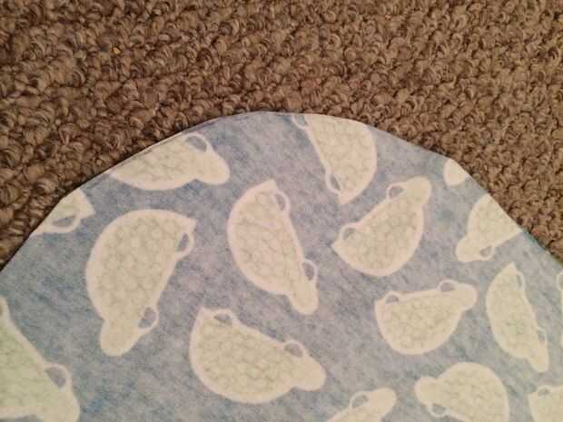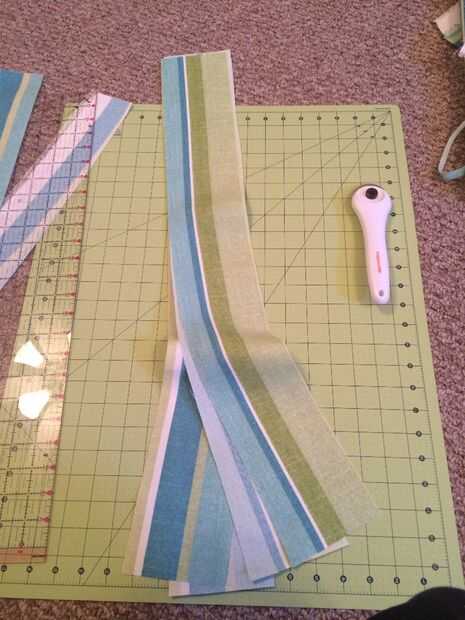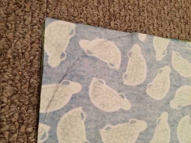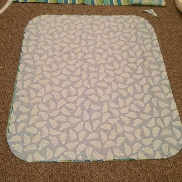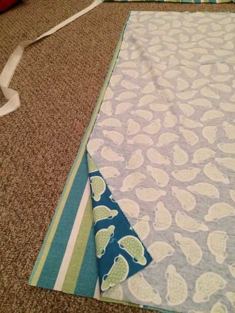 Usted necesita cortar dos piezas 36 x 42 pulgadas, una de cada tela. Ahora poner los dos uno encima del otro con los derechos uno frente al otro. Desea dibujar en el lado equivocado. Ahora coloque un recipiente en cada esquina y dibujar alrededor de la taza. Esto le dará bien redondeados. Corte las esquinas redondeadas que corte ambas piezas de tela. Ahora cortar cuatro tiras de 28 x 4 pulgadas. Tenía material extra por lo que les hice todo desde el mismo material pero te puede hacer dos de cada tejido.