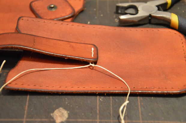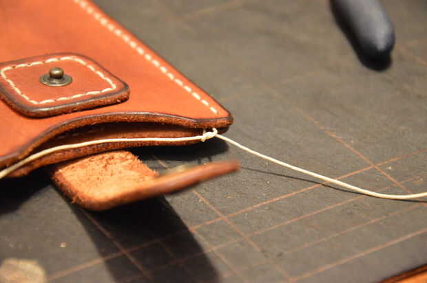 Cuando termine de una costura, un nudo (doble), cortar el exceso de hilo y presione el nudo entre la costura así que está bien escondida (el punzón puede resultar una herramienta útil para empujar el nudo bajo la piel).