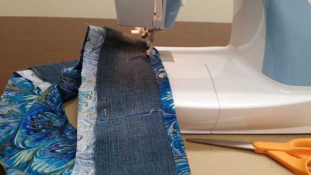 Girar a los lados de la tela bajo 1/4". Girar bajo otra vez 3/4". Prender la vuelta. Repita con el otro lado. Coser por ambos lados, dejando 1" espacio abierto para el elástico.
