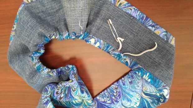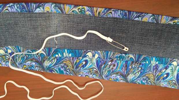 Corte 2 piezas de 1/4" elástico, cada 30" largo. Coloque un perno de seguridad grande hasta el final de una y empujar a través de un lado de la cubierta del volante. Mano coser los extremos juntos. Repita con el otro trozo de elástico en el otro lado de la cubierta del volante.
