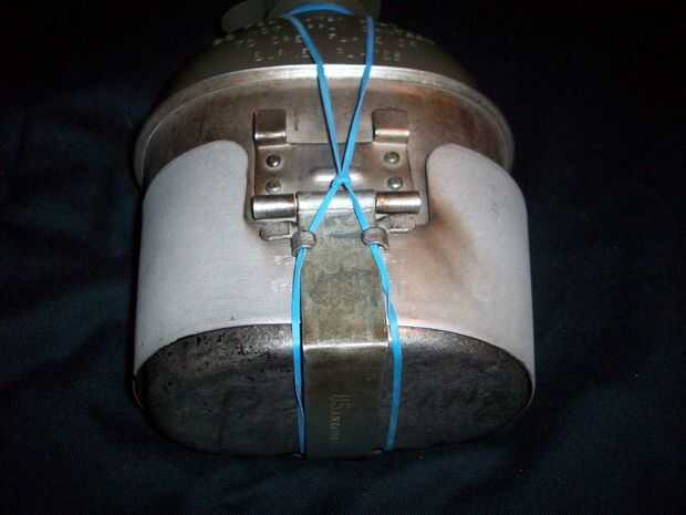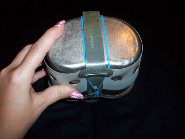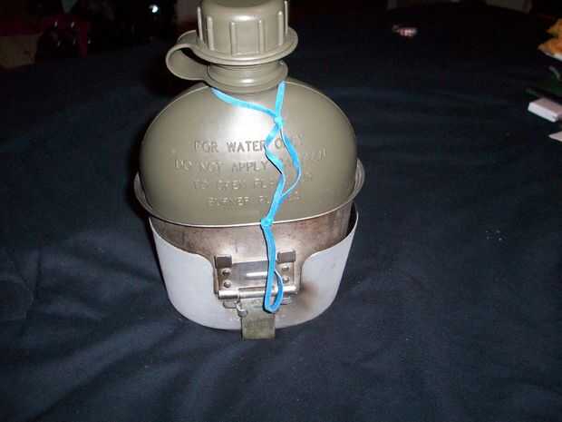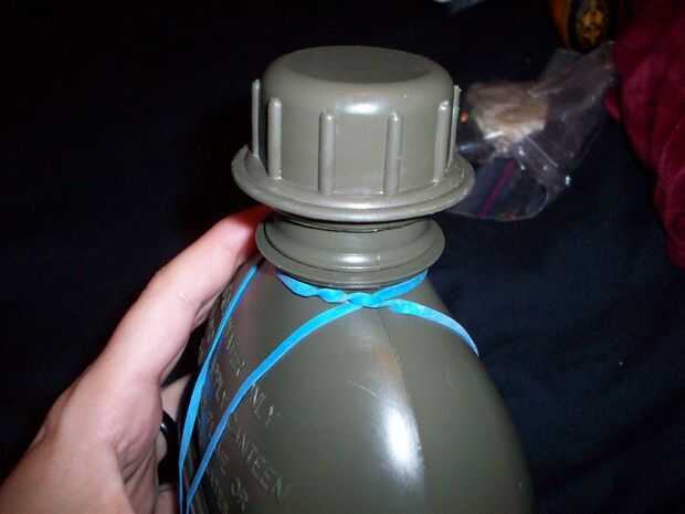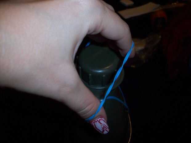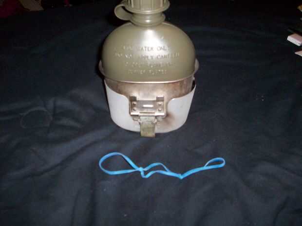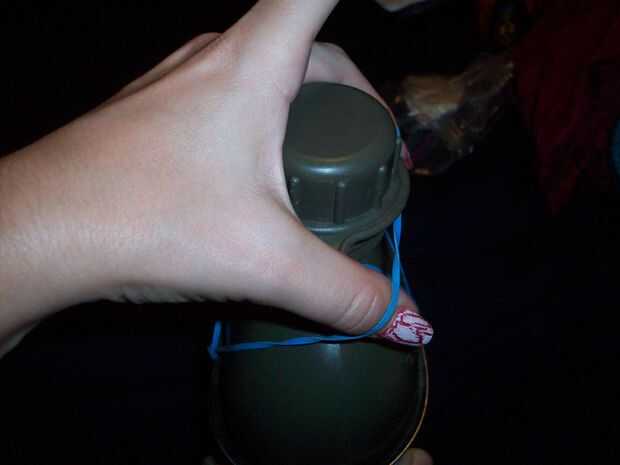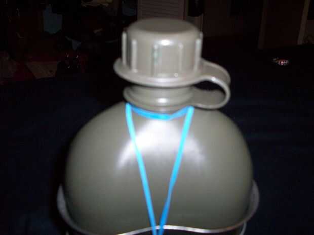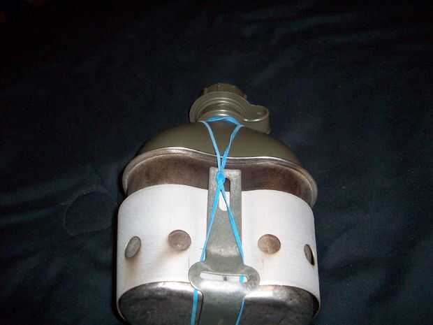 Lazo de la cadena bajo su taza de cantina y por el otro lado, con la banda de goma final lazo a lazo alrededor del cuello de la cantina, pero en la dirección opuesta de su bucle original.