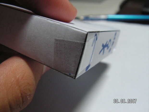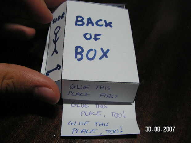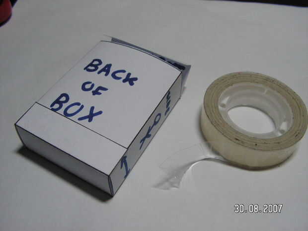 [Nota: la parte delantera de la caja tiene dos piezas que salen de la parte inferior (si usted dobla bien). Asegúrese de que vienen en el otro plano adjuntas a la parte posterior. Compruebe la imagen de abajo para más detalles].