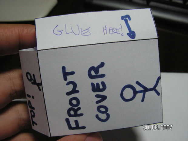 Ahora, es el momento para pegar la segunda parte. Compruebe el cuadro 3 a continuación. la parte marcada con pegamento aquí, debe ir debajo de la aleta opuesta que dibujado o impreso algo.