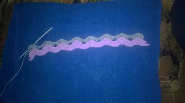 (representa una triple) entonces trabajando en los lazos traseros, tr en 2sts siguiente, * 3dtr en siguiente st, tr en 3sts siguiente, saltar 4sts, tr en 3sts siguiente. Repetir desde * terminar. vuelta de CH1