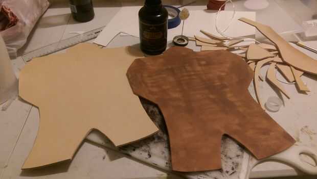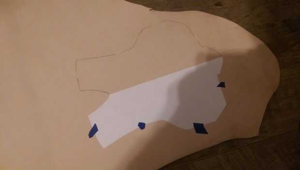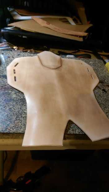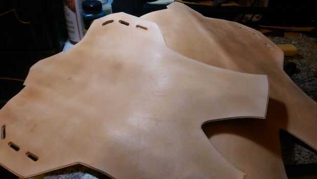 así, tuve clase de eyeball original atrezzo de la película e ir desde allí. tengo las medidas de mi cliente de rodilla a tobillo y alrededor del becerro en justo debajo de la rodilla y alrededor de su tobillo. para una plantilla usé algunos dibujo papel de 14 x 20". el cuero era un peso pesado, 7-8 oz, engrasado y los problemas algunos para ablandar para arriba. luego usé un punzón oblongo de 3/4" para los orificios de la correa hasta la parte superior.
