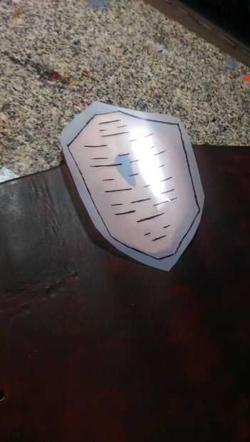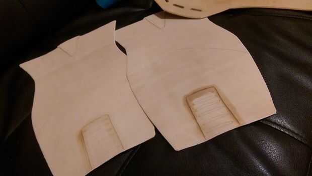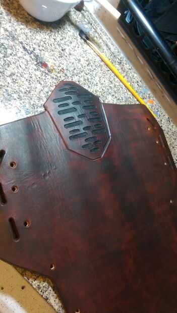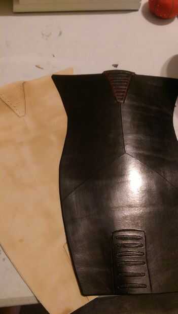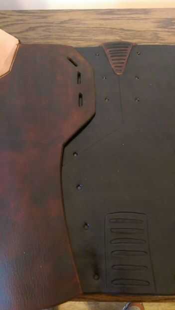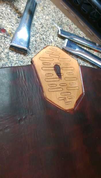 usé algunas herramientas para imitar el aspecto de los puntales de la película. sólo un eslabón giratorio cuchillo y fondo sello. que libre más de él. usé 1/2, 3/4 y 1 pulgada golpes oblongo, parcialmente perforado en la piel, para el patrón en la rodilla. utiliza la herramienta de sello de fondo en esos patrones, entonces usé un cepillo y teñió el negro. He utilizado la luz marrón (sí, es el tinte de color marrón claro de fiebing) para los frentes y USMC negro para la espalda, excepto el triángulo superior.