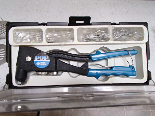 - Pop remachadora y remaches (específicamente para el uso en situaciones finas - como el remache a la derecha en la tercera foto) - que pueden obtenerse en la mayoría de las ferreterías o de automoción de la fuente casas.