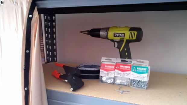 g.) cortina de ducha de bañera de tamaño de. Usé a tela porque el trazador de líneas plástico atraerá el aserrín, pero supongo que es un problema si usted quiere ver las cosas en los estantes. Mina se utilizan para el almacenamiento regular, no cosas utilizo todo el tiempo. Si tienes estantes más grandes, supongo que se podría utilizar una sábana vieja.