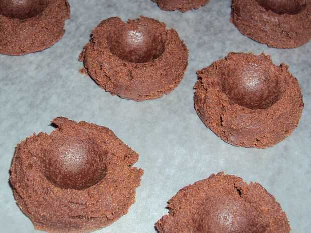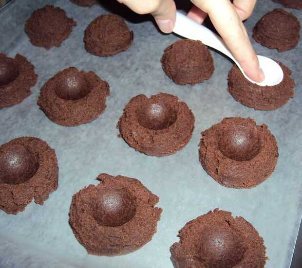 Después de que han establecido algunos, pulse una pala pequeña o cuchara (sólo utilicé mi cucharadita) en el centro para crear un cuenco pequeño. Ser suave para no fisurar las cookies.