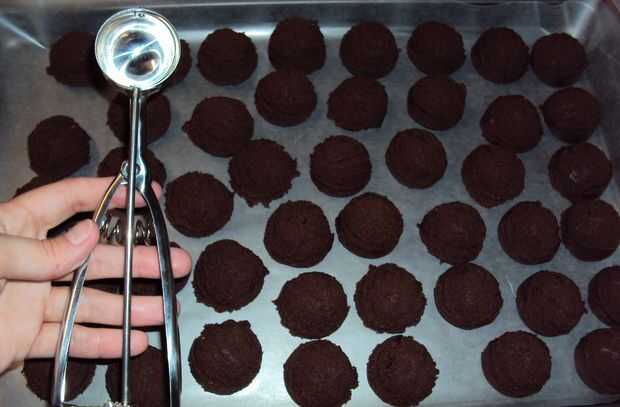 Si no tienes una bola de galleta, enrolle la masa en bolas (cerca de 1 pulgada cada uno) y ponlos en una bandeja forrada con papel de cera. Si la masa es demasiado pegajosa, dejarla enfriar durante un rato hasta que sea más fácil de manejar.
