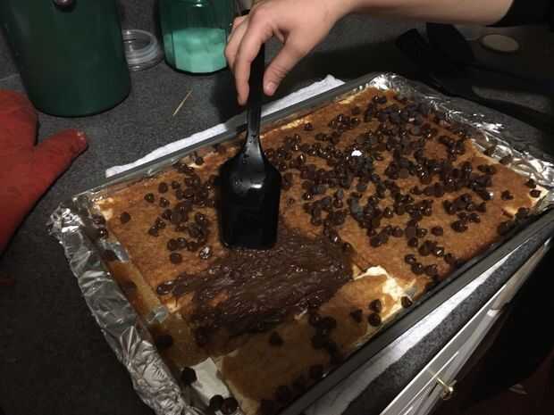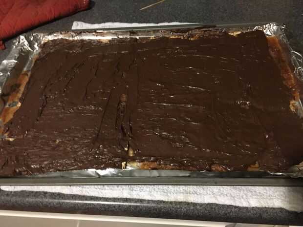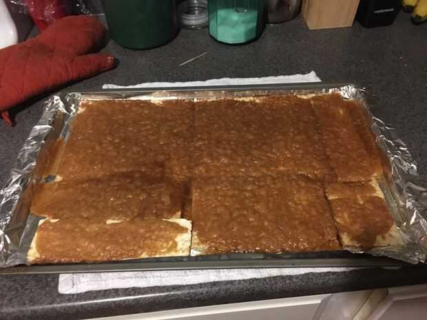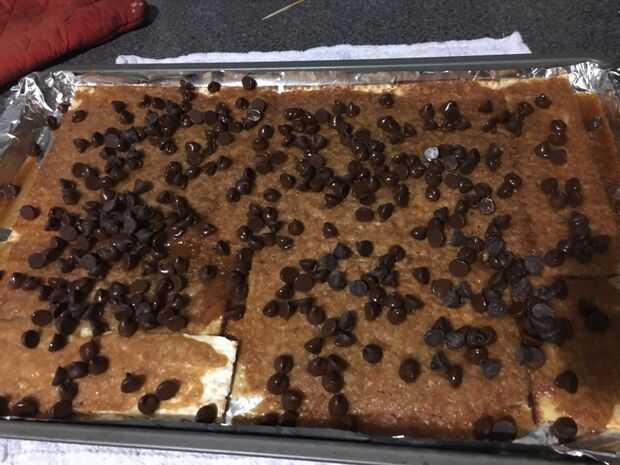 Después de 10 minutos de cocción, retire el matzo del horno. El azúcar morena y la mezcla de mantequilla en la parte superior se verán bonito y burbujeante. Inmediatamente extendió 1 taza de chispas de chocolate encima de la matzá y luego los dejo reposar 5 minutos.