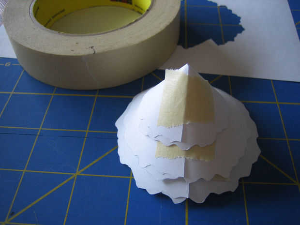La foto no se ilustran, pero cortar las cuñas en los conos a aproximadamente 30°. Después de comprobar con la cinta, me fui con algo cerca de 90°.