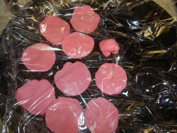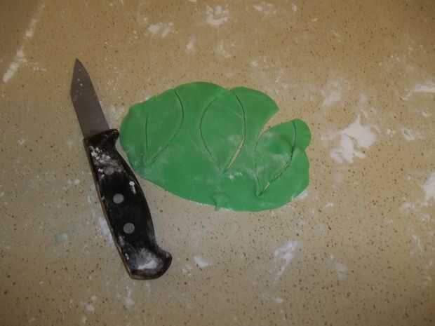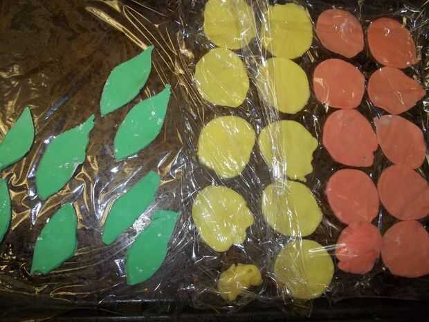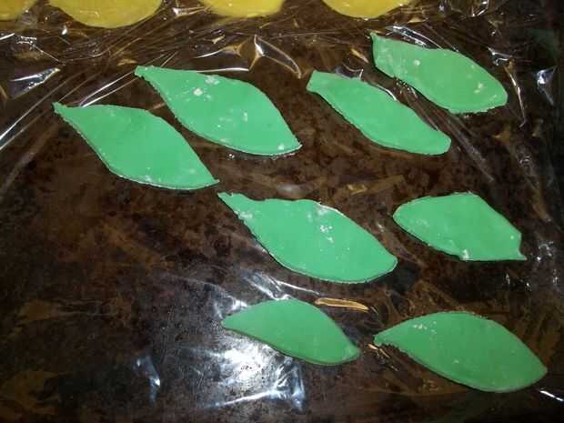 Usted necesitará cortar nueve círculos para los pétalos y save lo que tiene sobra para cubrir la fresa. Repita este paso para cada color que esperas para el verde. Con su verde ruede hacia fuera y cortar formas de hojas de él y reservamos para más adelante uno o dos por cada flor.