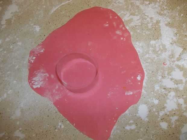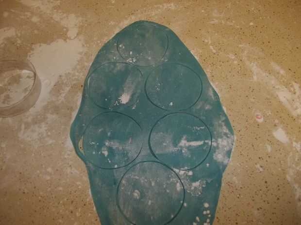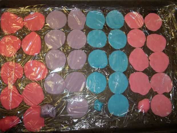 Estirar el chocolate a una capa muy fina no más entonces 1/8 pulgada de espesor. Utilice un cortador redondo pequeño (1,5 pulgadas) para cortar círculos de plástico. Si no tienes un cortador puede hacer uno de una pequeña botella de agua como yo lo hice.