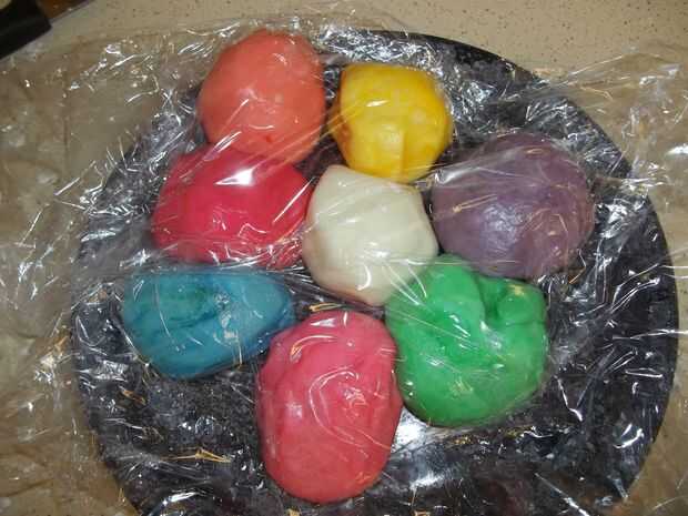 Usar el colorante para teñir tus rosas. Elegí hacer un esquema de color pastel de arco iris. Seis colores diferentes para pétalos, verdes para las hojas y los uno a la izquierda blancas. Usaba una gota de colorante para cada pieza pero se puede utilizar para o tres para un efecto más intenso de color. Cuando no está utilizando su cubierta de chocolate firmemente con plástico envolver y guardar en el refrigerador si su espacio de trabajo está caliente.