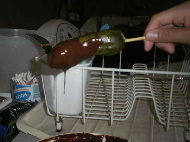 Una vez que los encurtidos son sacados del congelador, tienes que hacer este paso rápidamente. Cubra todos los encurtidos con el chocolate y si quieres decorar, esto sería un buen momento.
