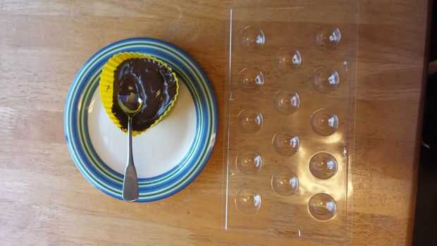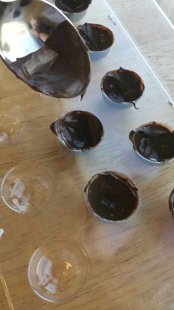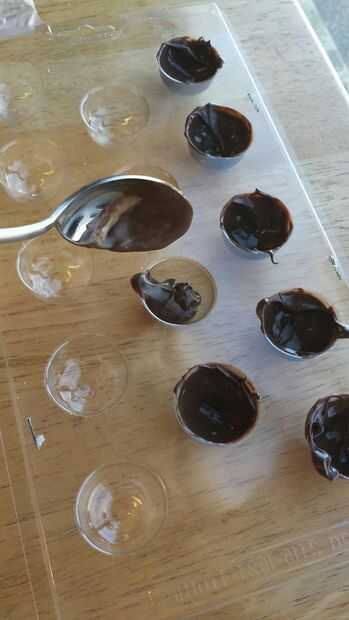 Después de que se derritan los derretimientos de caramelo, usé una cuchara para recubrir el interior de cada molde con el chocolate. Realmente no importa cómo se ve el interior, desde el exterior se verá fino y esa es la parte que la gente ve. Estos dulces se derrite firme arriba bastante rápidamente ya que no calientan les mucho, por lo que solidifica muy rápido cuando les pongo en el molde. Todavía les pone en la nevera durante unos minutos solidificar completamente aunque!