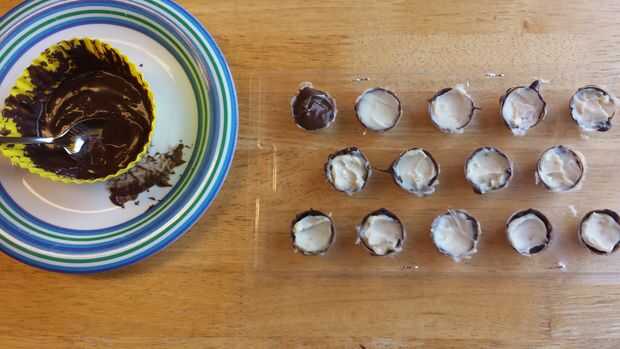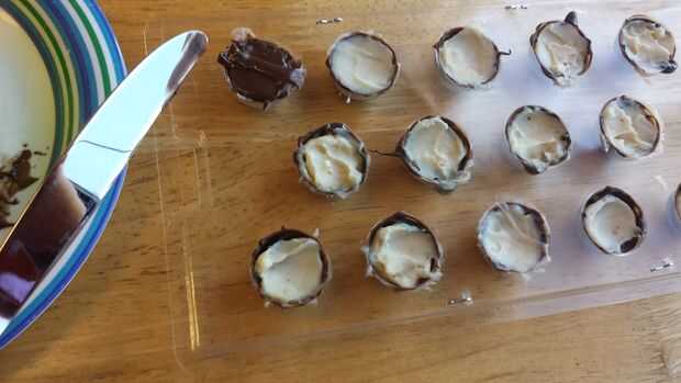 Microondas que el chocolate caramelo se derrite otra vez y cuidadosamente Vierta en los moldes encima de la grasa de tocino. Asegúrese de que toque todos los lados del molde y la concha de chocolate que usted vierte en primera. Trate de hacerlo relativamente plana para que tus chocolates pueden sentarse erguido. Encontré un cuchillo útil para nivelarlos. Tienes que trabajar con rapidez porque la grasa de tocino congelado se enfría el chocolate derretido bastante rápido.