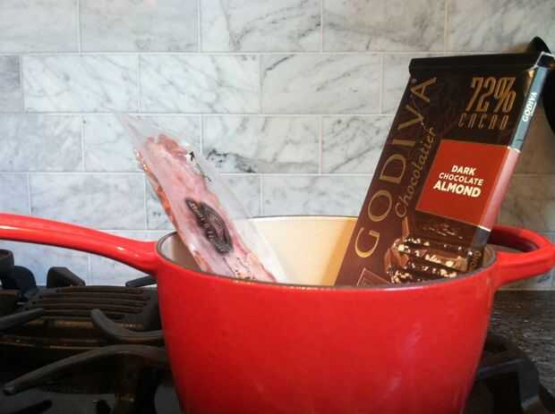Se reúnen bacon microondas, una barra de chocolate (y si no tienes una caldera doble) un tiesto pequeño y un recipiente.