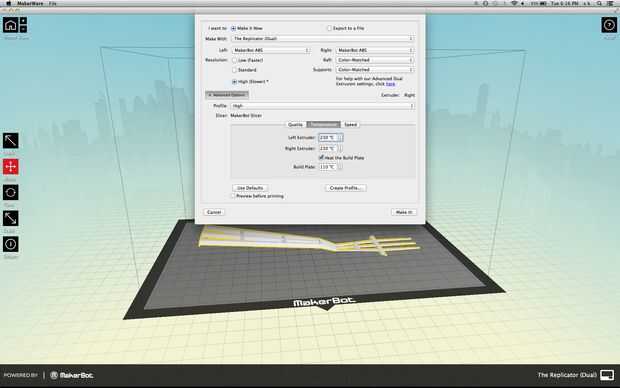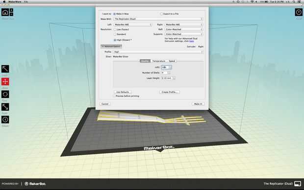 Importado el. Archivos STL uno a la vez en makerbot, comprobado todo estaba bien, controlar mi configuración (relleno, temperatura, velocidad, etc.) y golpe de impresión! Puedes ver mis ajustes en las imágenes. Eres propio puede variar la configuración óptima de la máquina. Impresión cada una tomó cerca de 1.5 horas.