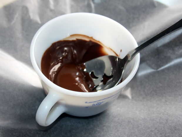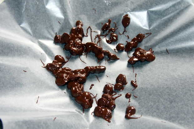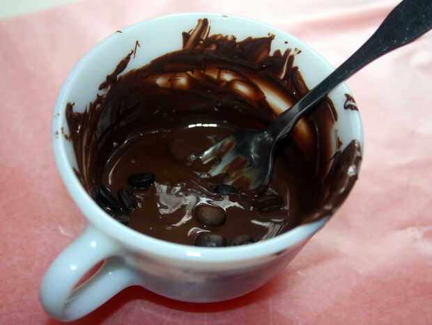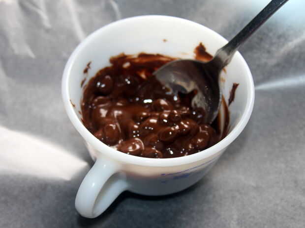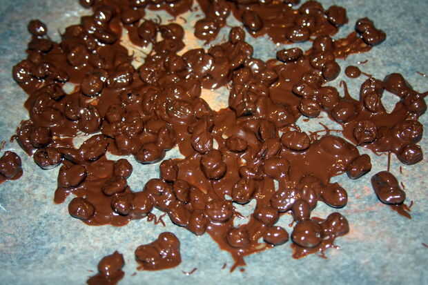 Después de que el chocolate se haya derretido, dunk los frijoles y luego drenan a través de una espumadera. Esto suena mucho más fácil de lo que es. He encontrado que el chocolate era mucho más grueso de lo que imaginaba. ¿Tal vez lo hice lo suficientemente caliente? Entonces traté de agregar un 1/2 cucharadita de manteca que parecía ayudar a la liquidez sin cambiar el sabor.