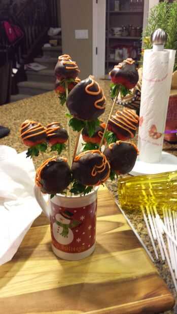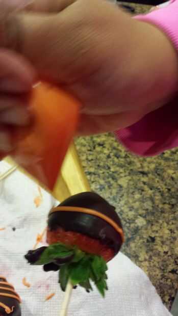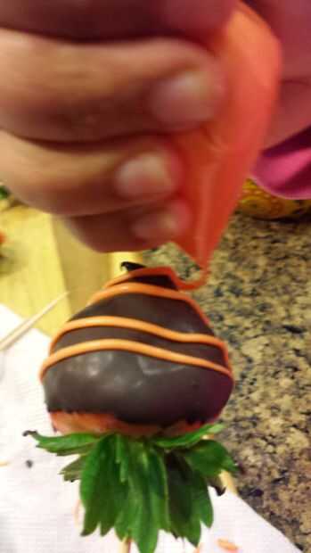 -Ahora en una bolsa de hielo o en un relleno de ziplock 4 cuchara de la naranja derretida chocolate. Corte el gancho de la bolsa de hielo. Suavemente gire la parte superior y empezar a decorar la fresa. El secreto es mantener la bolsa de hielo poco más alta que la fresa.