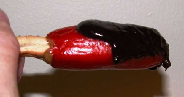 Abra los Jalapeños rellenos y presione los palitos de pretzel en la mantequilla de maní. Cerca de Jalapeños. Inmersión o cuchara el chocolate derretido en los Jalapeños rellenos, lo que funciona mejor para usted.