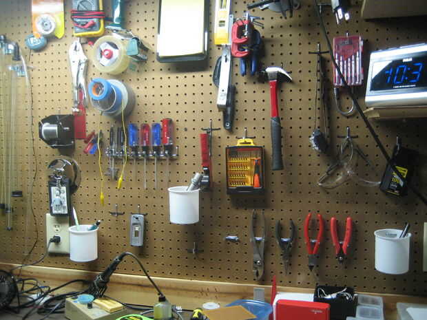 comencé a reorganizar mis herramientas en el pegboard encima de mi mesa de trabajo que tiene las herramientas que utilizo con más frecuencia en el lugar de lo que yo era allí. En la foto es mi martillo. Observe cómo derecho cuelga el mango. Fue no