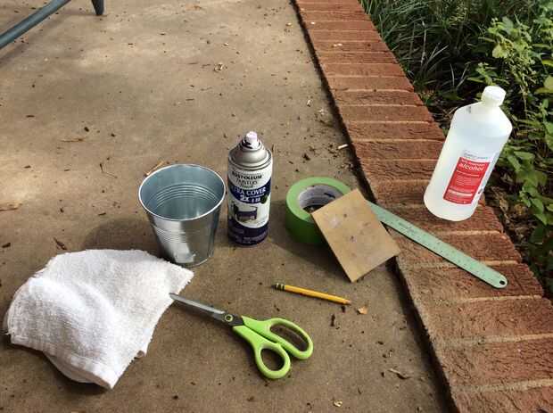 Para este proyecto utilicé una Trapo Alcohol isopropílico Papel de lija Tijeras Cinta de pintor rana marca Dos en un sharpie Pintura en aerosol brillante morado Y este pote de flor pequeña astilla