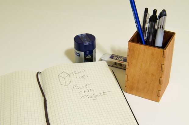 Mi objetivo fue diseñar una taza, prueba los fundamentos de lo que puede lograr un molino CNC. La Copa es un empalme del dedo cortado de material grueso de 5mm midiendo 4" de alto por 2 1/2" de ancho. La parte inferior de la pared tiene una ranura para encajar la base.