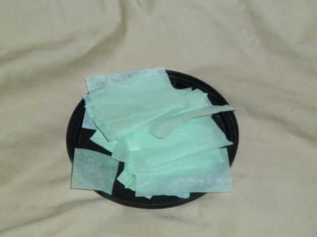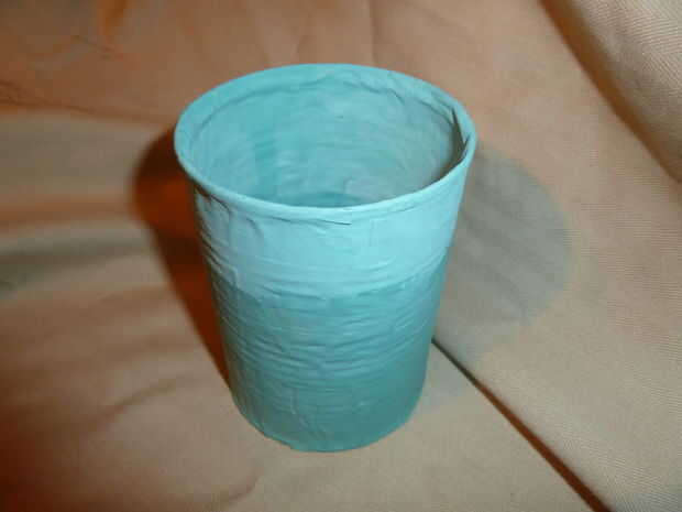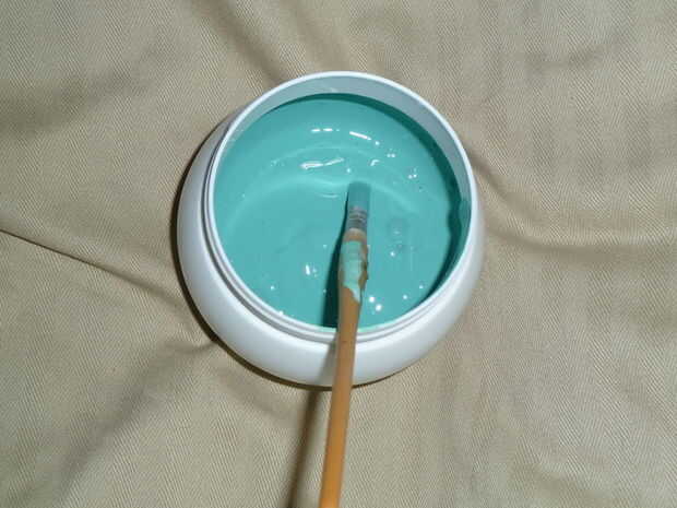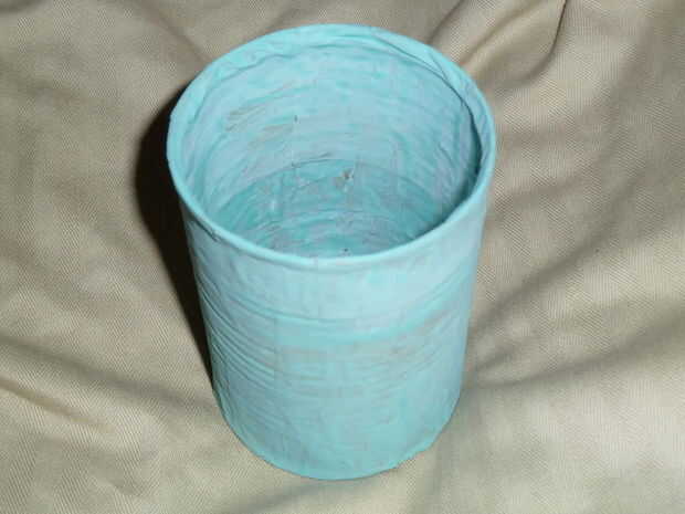 Agarrar el papel que va a ser en la capa externa de la lata y cortar en trozos. Apartarlas y mezclar la pintura. Para este tutorial he utilizado verde azulado pero usted puede hacer cualquier color que usted desea. Mezcle la cantidad apropiada de alimentos para colorear en su pintura. Para teal, pasa a ser de 10-15 gotas de verde y 10 de azul. Pintar sobre el papel.