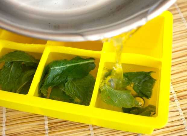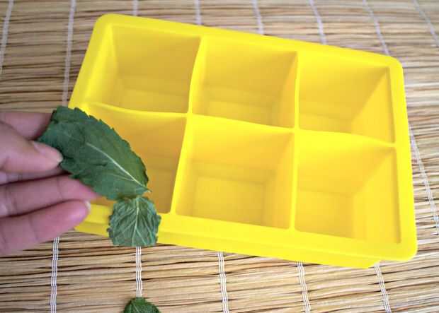 ¿Esta parte es opcional, pero que no le gusta algún saborizante de menta en su limonada? Simplemente puse un par de hojas de menta en cada cuadrado del cubo de hielo y vierte el agua hervida nuevamente. Estos se congelarán maravillosamente, como las hojas será perfectamente visibles a través del hielo claro.