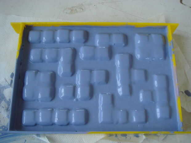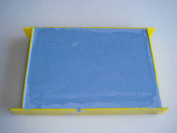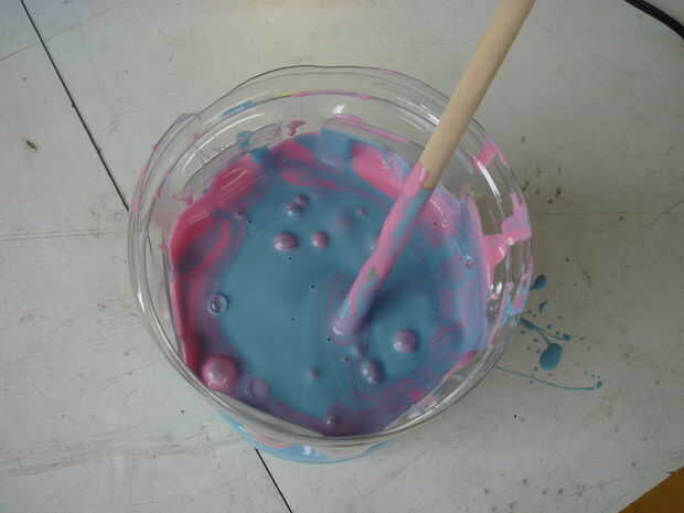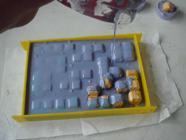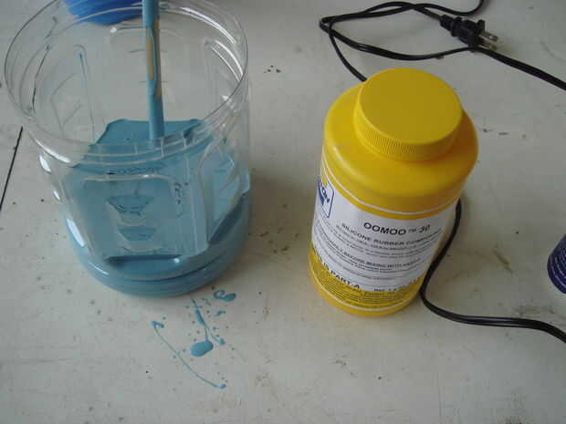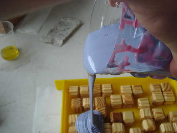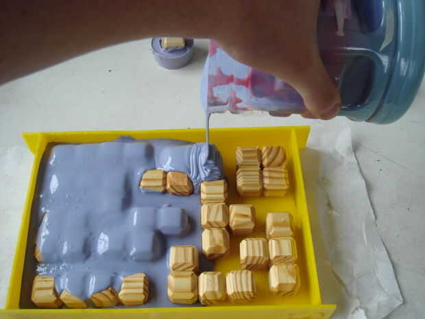 Vierta la mezcla de silicona sobre los bloques de madera, relleno de la cubierta a la llanta.