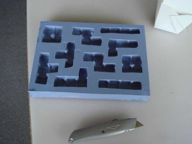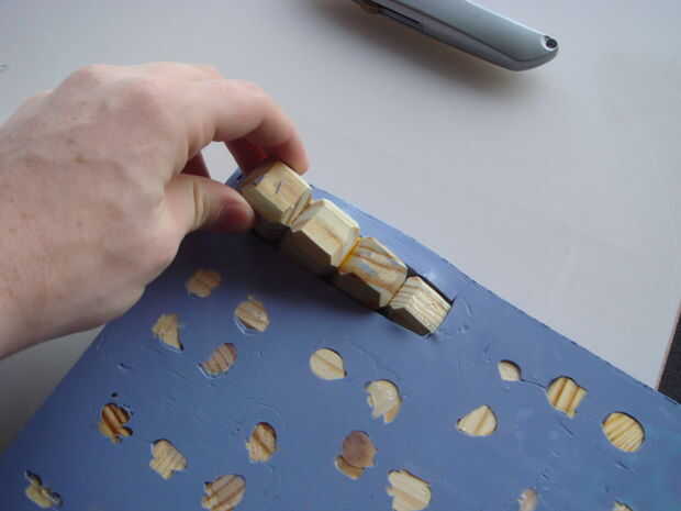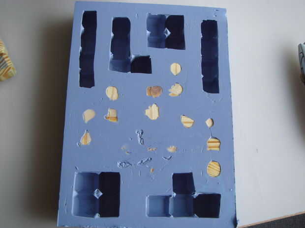 Usando un cuchillo del exacto corte la silicona atrapando los bloques en la negativa. Una vez extraído suficiente silicona flex un poco el molde, y debe poder pelar las piezas de tetris de madera.