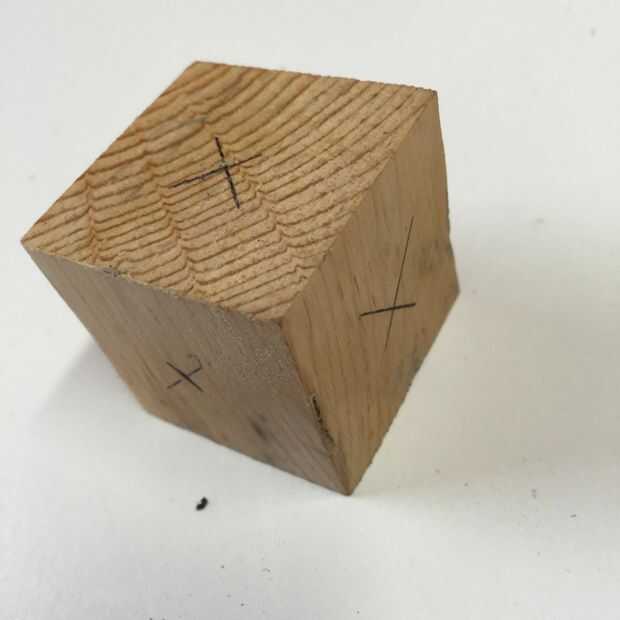 Con un borde recto que fue alineado de esquina a esquina, marque el centro de cada cara del cubo (la X que se ve en la foto).
