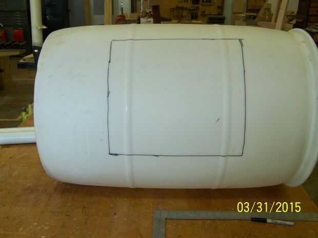 Hice mía 16 pulgadas x 15 pulgadas. Esto parecía un buen compromiso que quería una abertura lo suficientemente grande para hacer las cosas dentro y fuera, pero no tan grande como distorsionaría el barril.