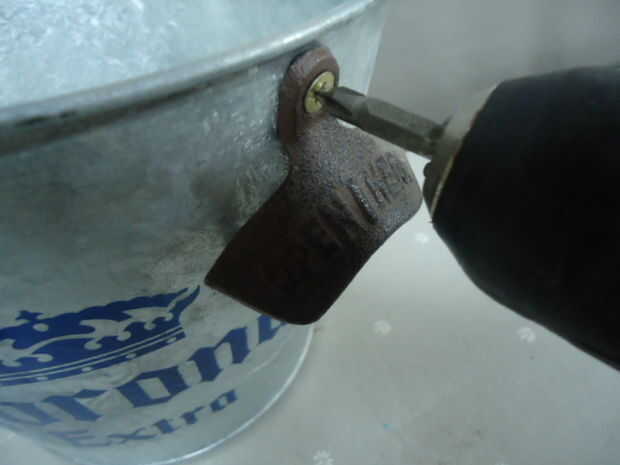 5. Coloque el abrelatas de botella sobre los agujeros e inserte el tornillo en el orificio superior de la apertura y luego a través del placa de respaldo. Atornille la tuerca al perno de tornillo. Repita para el orificio inferior y apriete los tornillos y tuercas.