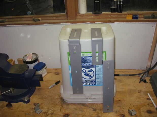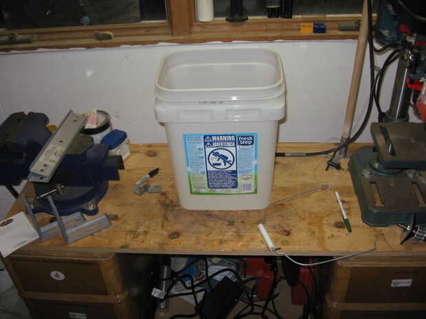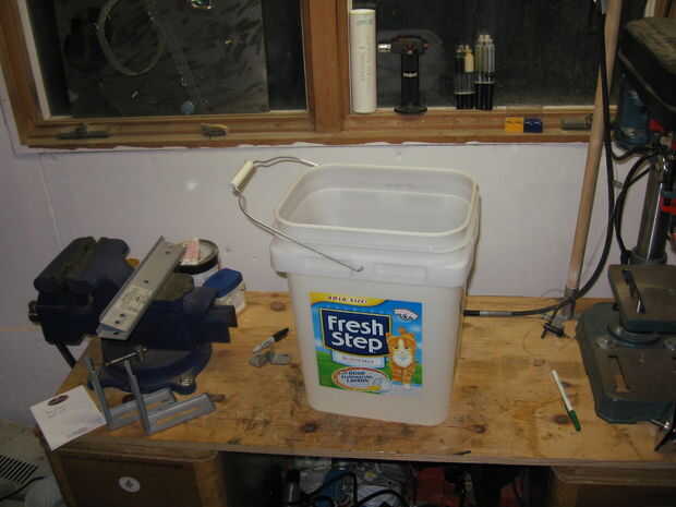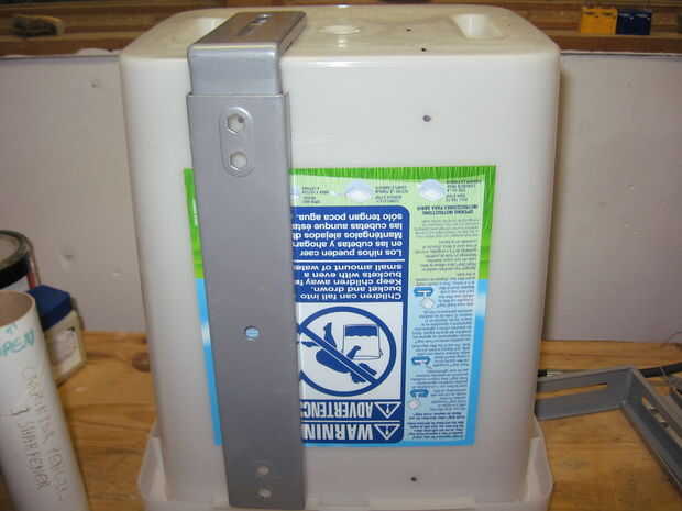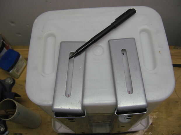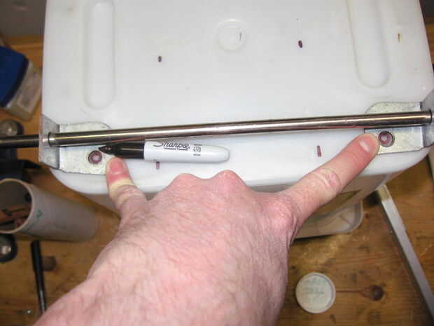 Con la empuñadura quitada voltea el cubo en la mesa de trabajo para que la abertura apunte hacia. Entonces coloque sus piezas en forma de "L" en el cubo para determinar donde desea montar. Tuve la suerte en que el metal que estaba usando para esto tenía grandes espacios abiertos en el centro. Esto me permitió hacer marcas directamente en el cubo.