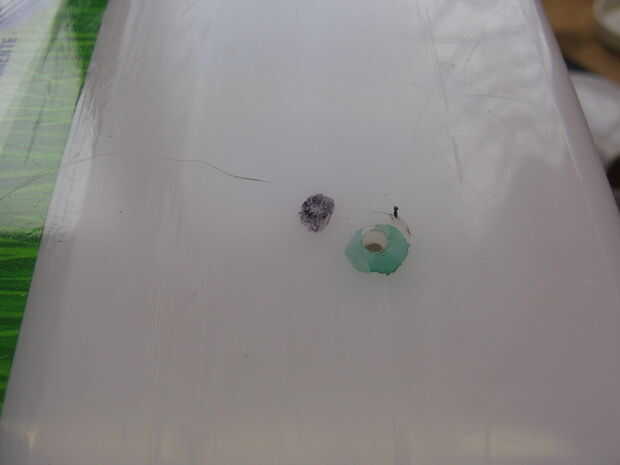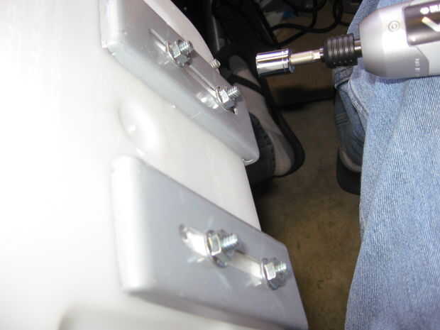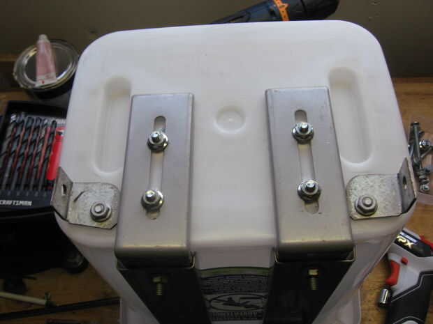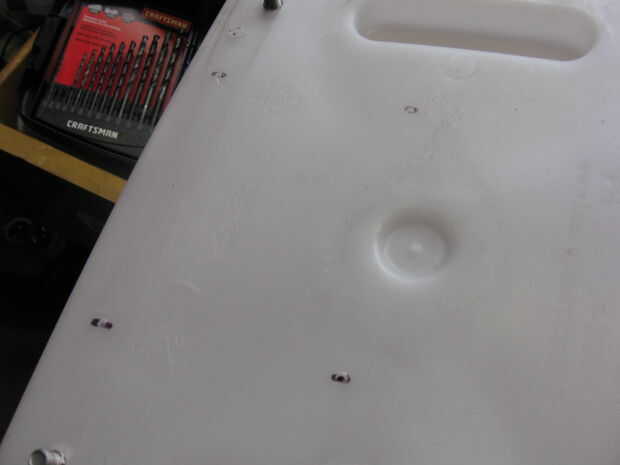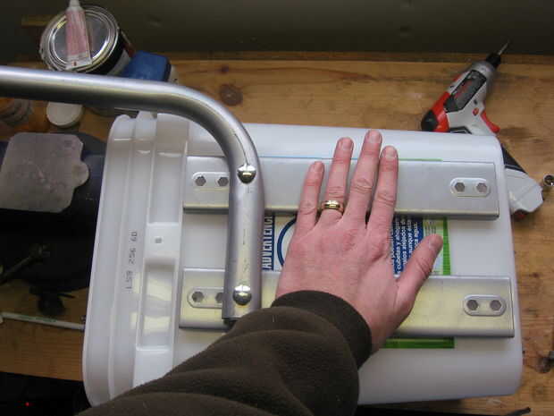 Ahora que el montaje de la manija mantenga en el cubo para verificar las marcas realizadas anteriormente son aún válidas. Mina no como cosas bajaron un poco durante el proceso de perforación y montaje. Asi que me hice nuevas marcas con un marcador de diferente color. Luego perforé orificios piloto seguidos de grandes orificios para los tornillos. Esta vez representaban para los cuellos de perno y hubo b-f durante el apriete.