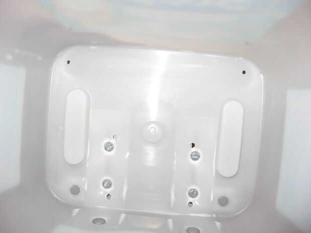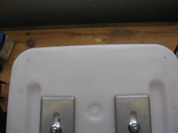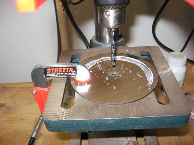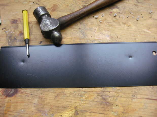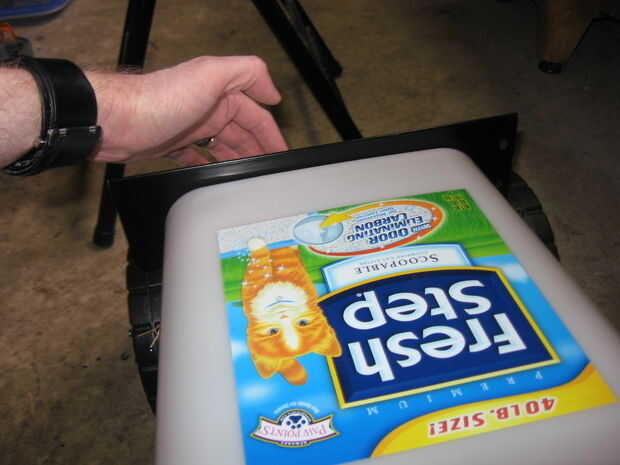Luego perforé dos agujeros en la parte inferior de la cubeta que los tornillos pasar a través. Usé estos agujeros como plantilla para marcar la placa metálica que servirá de pie para apoyar el carro. Luego perforé los agujeros en la placa empleando el método descrito en el paso 5. Entonces era simplemente una cuestión de fijar el pie a los tacos y los tacos al cubo con tornillos para madera.