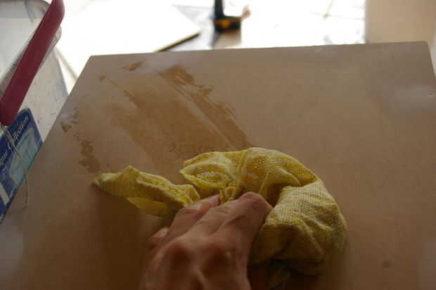 Tratar de que como poco relleno en la madera como sea posible, en las grietas y agujeros. suave varias veces con la espátula para sacar las burbujas de aire y luego deje que se seque. Siga las instrucciones de secado en la tina y dejar un tiempo extra, nada peor que el lijado húmedo pantano y tener que empezar de nuevo!