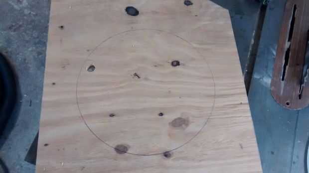 Tomar la pieza de madera contrachapada y girar el cubo boca abajo sobre la madera contrachapada y trazar el contorno del cubo en su madera. Asegúrese de dejar suficiente espacio en la madera para cubrir el asiento (en un futuro paso). Perfore un agujero dentro de su círculo de patrón lo suficientemente grande para una hoja de sierra caladora caber a través de.